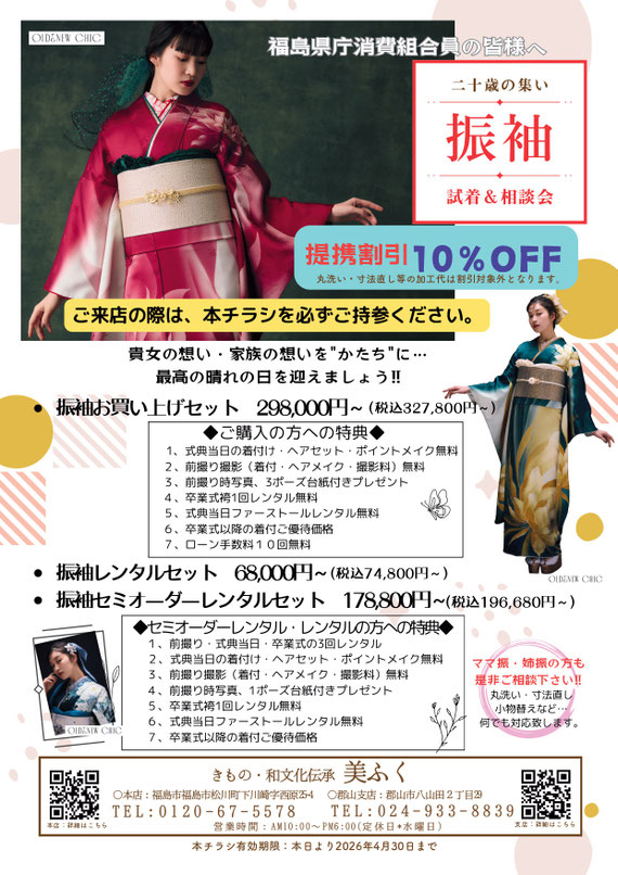 下のチラシをダウンロードして「美ふく」の店舗にご持参ください。